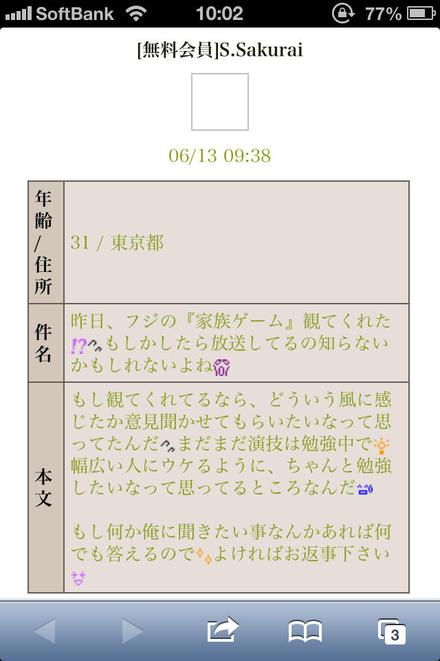 うけた!私も亀梨、向井、桜井等のマネージャーとか本人からってメールがすごい来てた時期があったけど、タイトルだけで消去でしょ、普通。