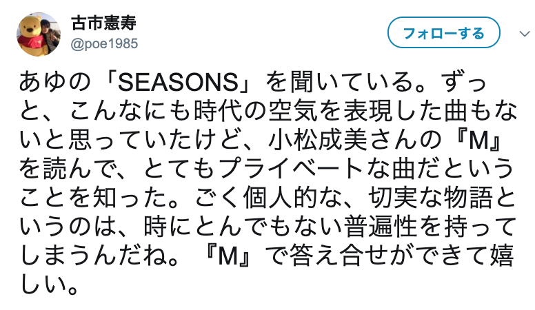 古市憲寿氏、浜崎あゆみの恋愛告白本に「答え合せができて嬉しい」 : スポーツ報知hochi.news社会学者の古市憲寿氏(34)が14日、自身のツイッターを更新。歌手・浜崎あゆみ(40)の大ファンで知られる古市氏は、今月1日に発売された浜崎の新刊「M 愛すべき人がいて」(幻冬舎)を読んでの感想を記した。