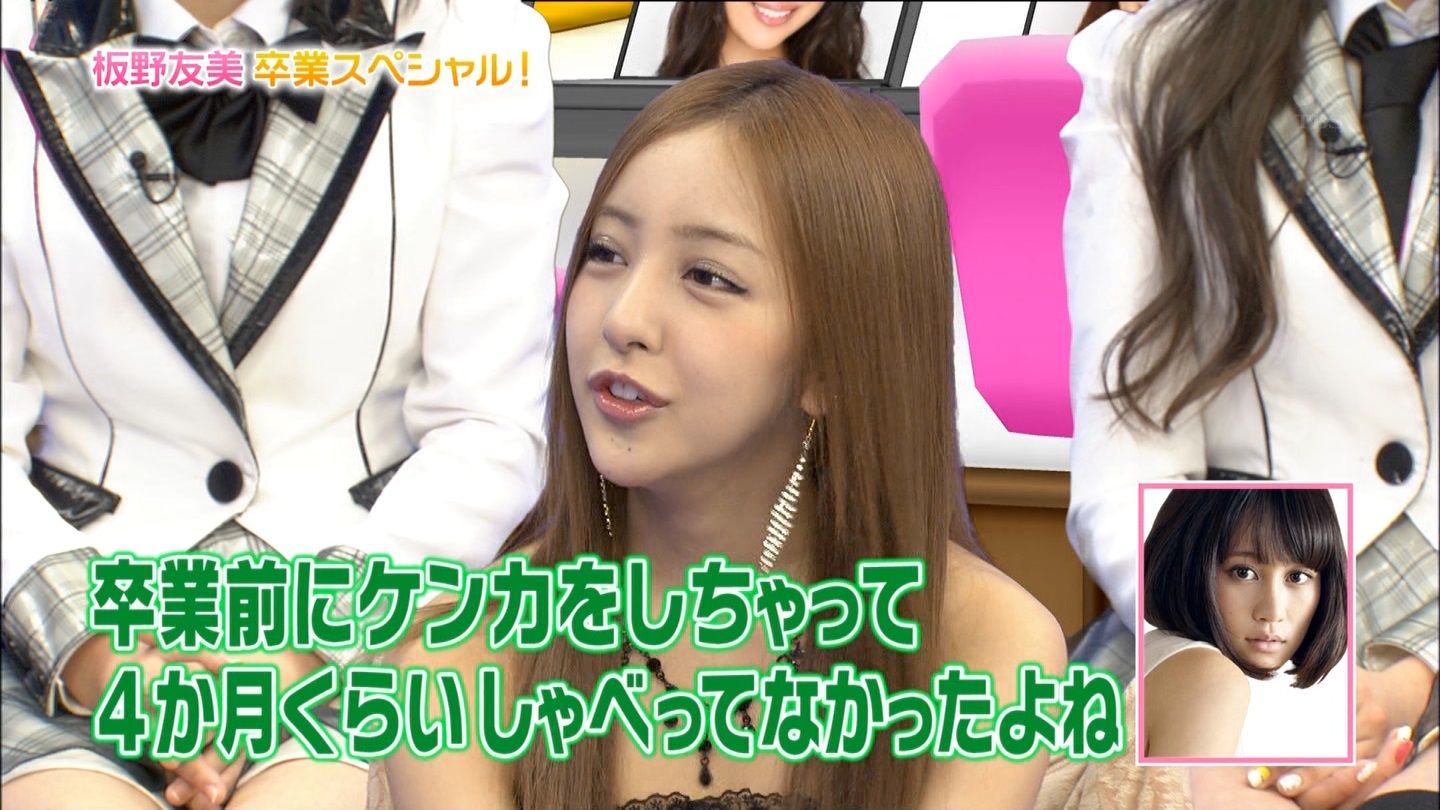 板野友美、前田敦子と「4ヶ月しゃべってなかった」(モデルプレス) - エンタメ - livedoor ニュースnews.livedoor.comAKB48の板野友美が、18日放送のバラエティ番組「有吉AKB共和国」(TBS系)に出演。女優で親友の前田敦子とのエピソードを語った。12年8月27日に東京・秋葉原のAKB48劇場で行われた前田さんの卒業記念公演で、板野さんは「敦子が卒業を決めてあと1か月っていうときに、ささいなことで喧嘩をしてしまって…」と明かしていたのだが、これについて司会の有吉弘行さんから「前田と仲悪い時期あったのね」と聞かれ「ありましたね。卒業前に喧嘩をしちゃって、4か月ぐらいしゃべってなかった」と告白した。