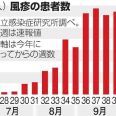 今年の定点当たりの報告数は、昨年同期のおよそ6倍になっています。咳・くしゃみが出る時は、他の人にうつさないためにマスクを着用しましょう。マスクを持っていない場合は、ティッシュや腕の内側などで口と鼻を押さえ、他の人から顔をそむけて1m以上離れましょう。+76