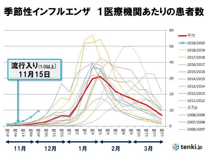 季節性インフルエンザ 患者数は昨年の6倍(日直予報士 2019年12月19日) - 日本気象協会 tenki.jptenki.jp厚生労働省によると、インフルエンザの12月2日から8日までの定点当たり報告数は9.52(患者報告数47,200人)となり、昨年同期に比べて、およそ6倍になっています。