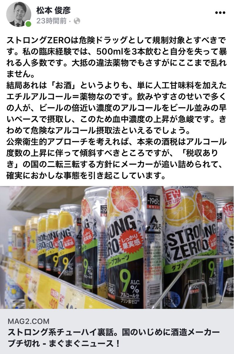 昨日かな?一昨日かな?もストロングゼロの記事出てたよね規制すべき飲み物的な感じで。+1019