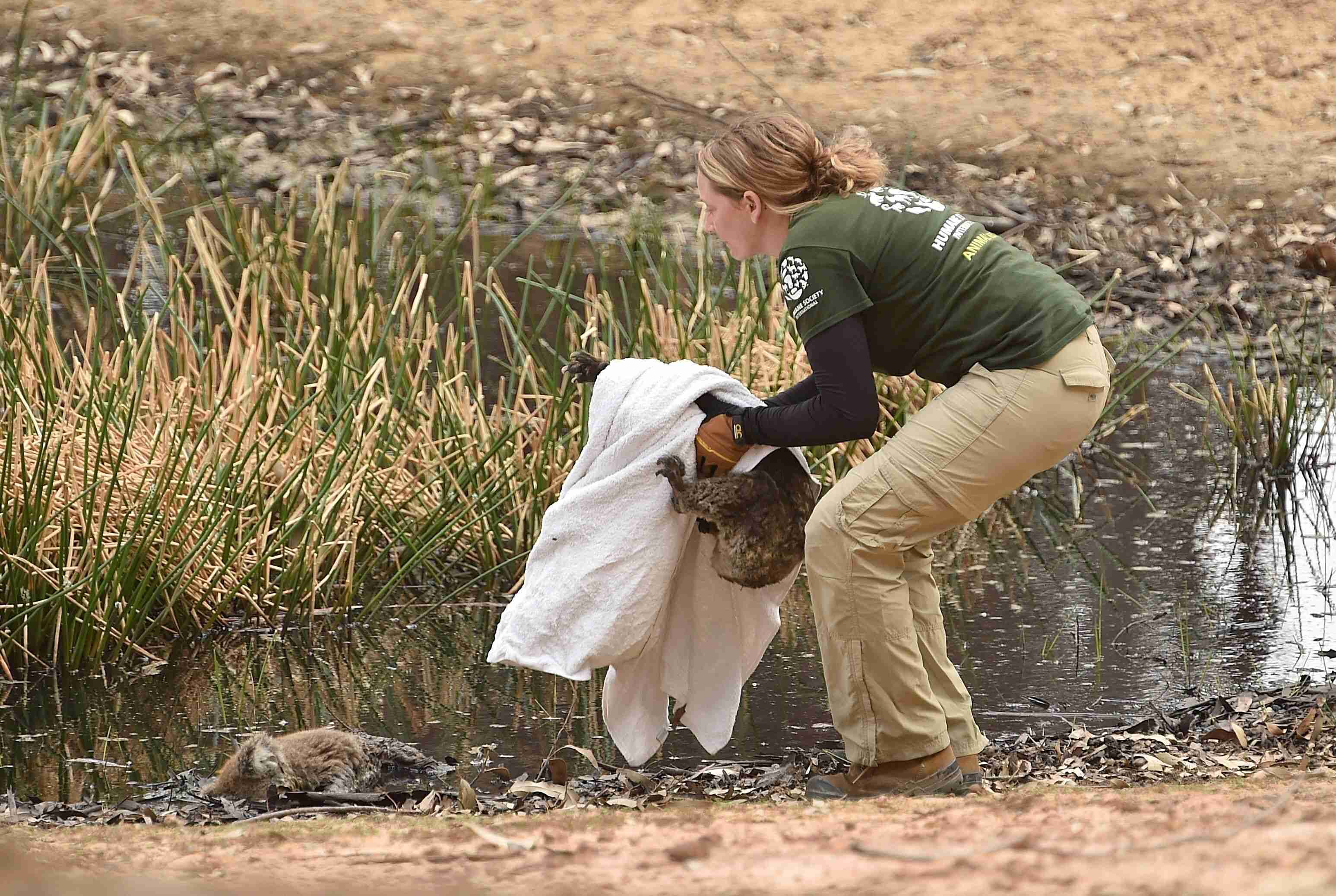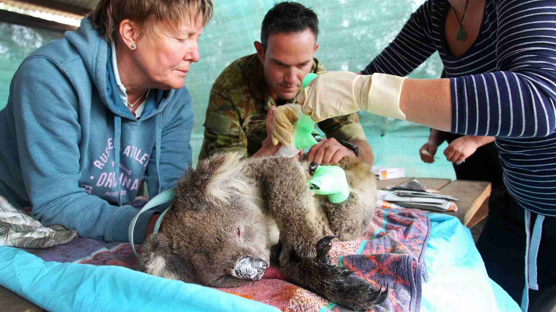 怪我をしたコアラをタオルで包み、無事保護