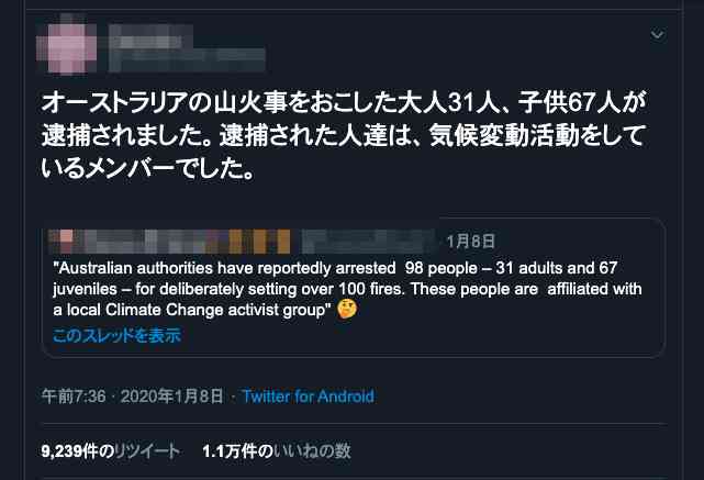 見てきたらアメリカと日本のSNSで「環境活動家」が放火して逮捕されたとあって拡散されたらしい。