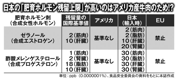 肥育ホルモンはオーストラリア、カナダ、ニュージーランドなどでも使用されている。ただし、アメリカ以外の国は、国際機関「コーデックス」が定めた基準を下回る残留基準値をそれぞれが取り決め、それを上回るものは出荷されないが、アメリカだけは「残留基準値の設定は不要」として定めていない。さらに、国内での肥育ホルモンの使用を禁じているはずの日本は、国際基準を大きく超える残留基準値を定めている。肥育ホルモンが“測定不能”なほど含まれているアメリカ産牛肉を受け入れるためでなければなんだというのだろうか。