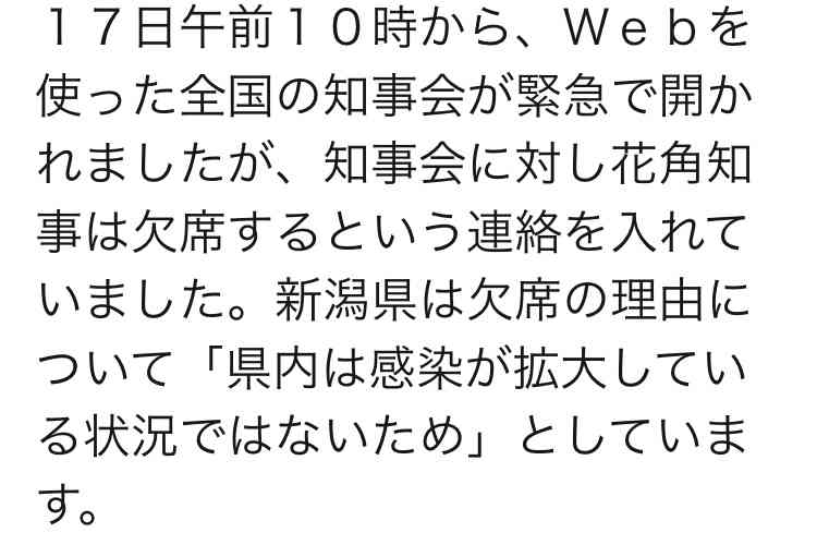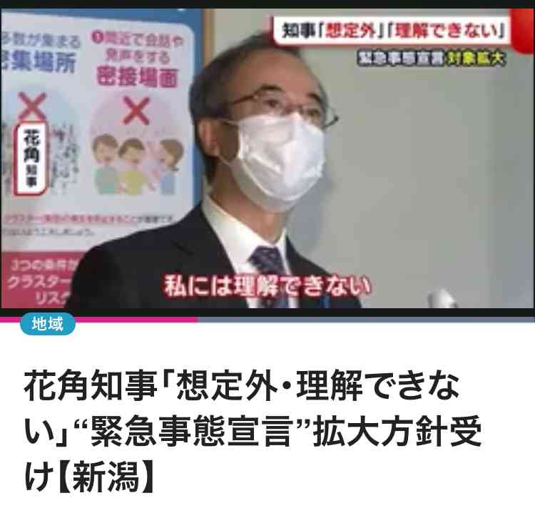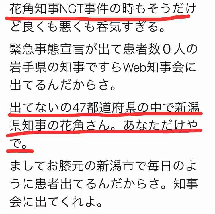 感染者ゼロの県の知事や、政令指定都市の市長が不甲斐ない中できちんと頑張ってる県の知事ですらこう言われてるのに新潟県知事は真面目に取り組んでるとは思えない対応をしてるのが本当に信じられません。NGT事件での対応と言い、県民の声を聞く気がない事がうかがえますし新潟県の皆さんにはなんとお声をおかけしたらいいのか分からないくらい気の毒に思っています。