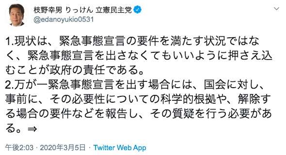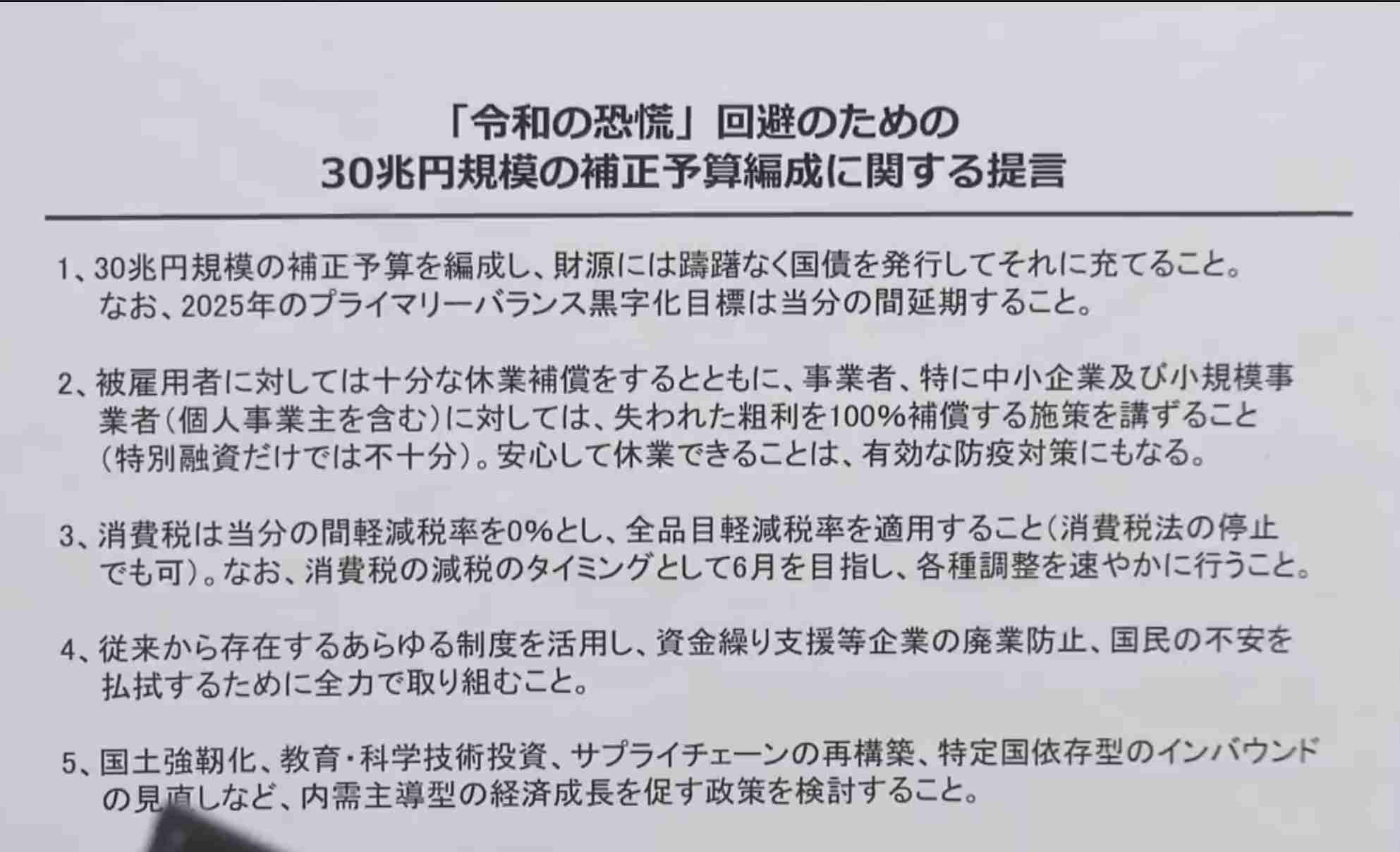 サービス業や飲食店といった被害が『直撃している』業界が潰れていくと、次第に製造業などあらゆる業界にも影響が波及していくでしょう。党内では『コロナ収束後のV字回復期』に向けた対策が語られていますが、このままでは収束後には多くの事業者が潰れていて“V字”ではなく“L字”になってしまう」+2812