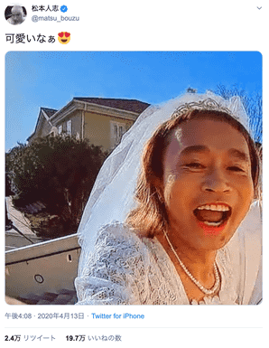 ダウンタウンの松本人志(56)が13日、自身のツイッターで相方・浜田雅功(56)のウエディングドレス姿の写真を投稿し、話題を呼んでいる。松本は午後4時過ぎ、浜田が花嫁に扮した画像を掲載した。ウエディングドレスにティアラを着用、化粧をほどこし満面の笑みを浮かべる浜田の姿に松本は、「可愛いなぁ」のメッセージ、目がハートマークの顔文字を添えた。