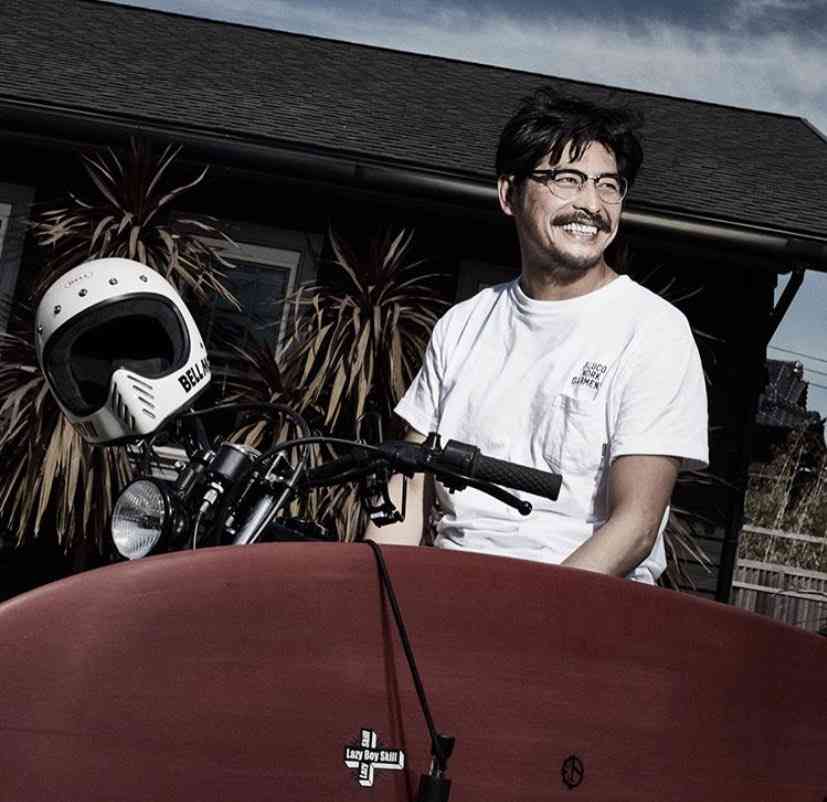 坂口さんは自らモデルとなって同店の新作コラボTシャツをPR。バイクにまたがり、眼鏡をかけ、ひげを生やしたワイルドな風貌を公開している。