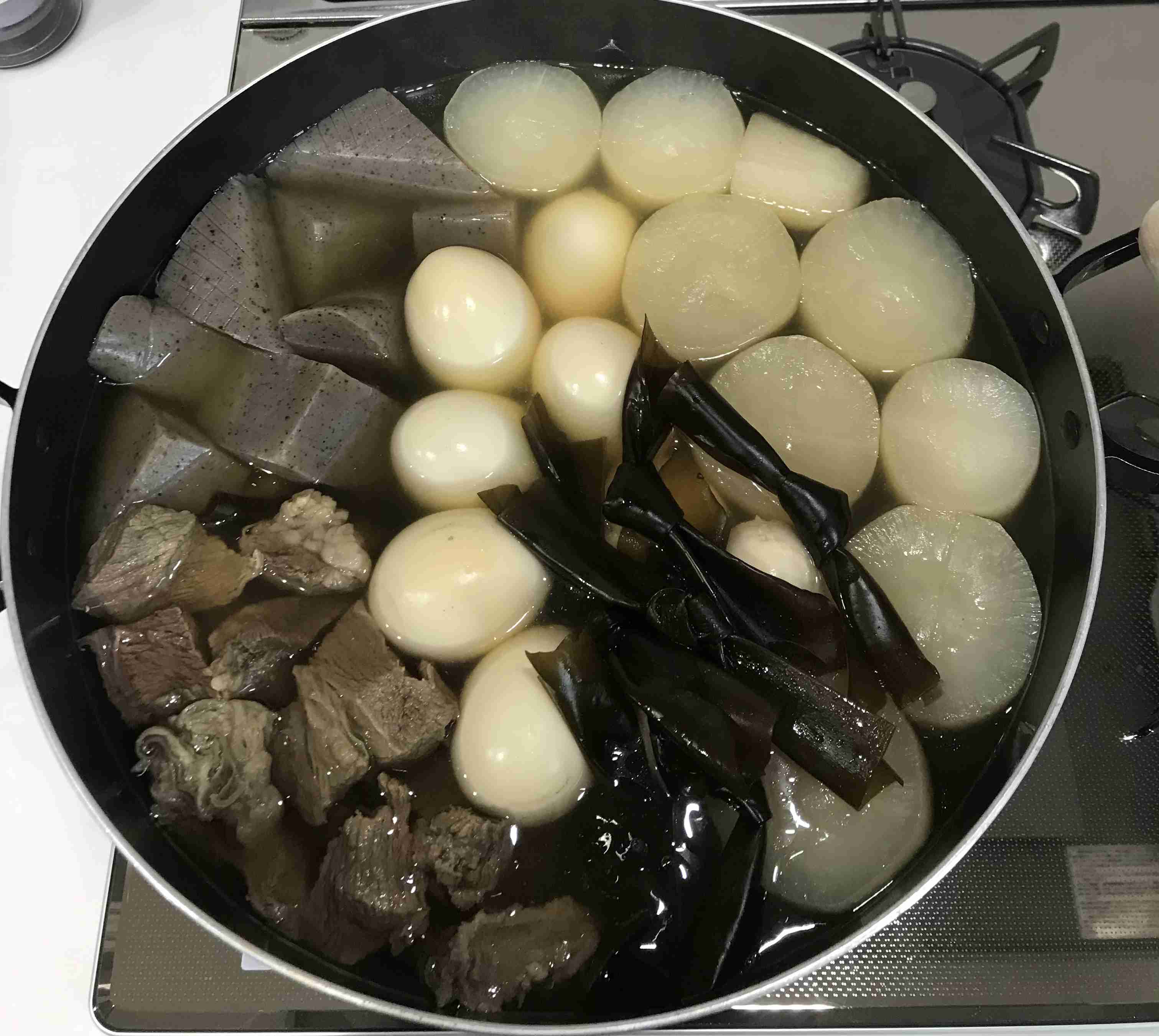 大根、牛すじ、玉子、こんにゃく、結び昆布で練りものは後から投入します。