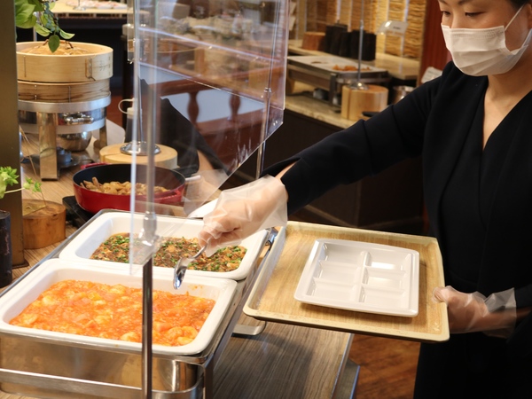 ホテルのブッフェはラップか使い捨てのプラカバーがされてるよ。