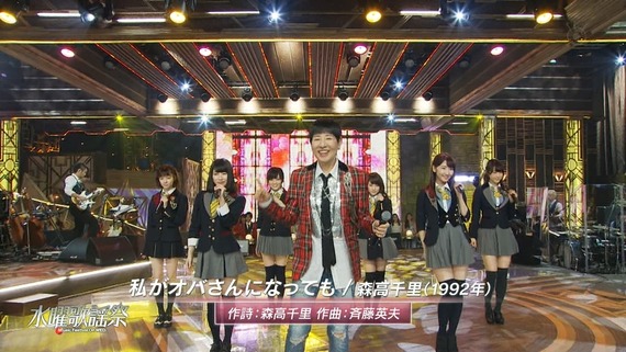 記念すべき1曲目は、和田アキ子とAKB48のコラボによる「私がオバさんになっても」(森高千里)。2曲目は、ももいろクローバーZによる「色・ホワイトブレンド」(中山美穂)