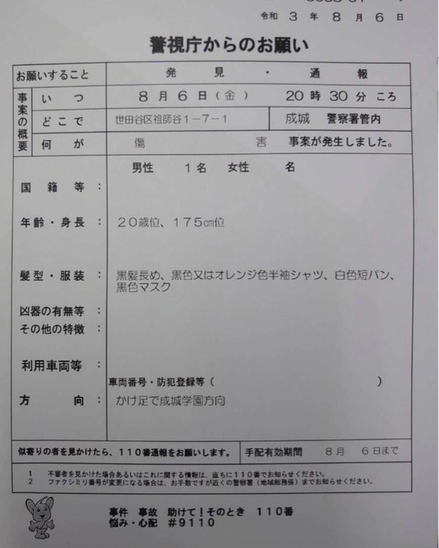 使った刃物は捨ててるけど、もしかしたら他にも刃物持ってる可能性あるから近くの人は本当に気を付けて!+42