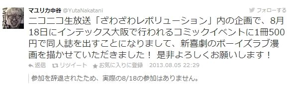 ニコニコ生放送「ざわざわレボリューション」内の企画で、8月18日にインテックス大阪で行われるコミックイベントに1冊500円で同人誌を出すことになりまして、新喜劇のボーイズラブ漫画を描かせていただきました!