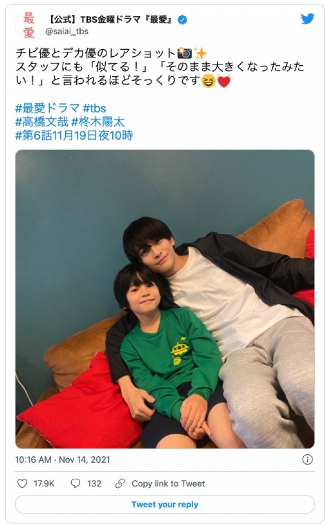 女優の吉高由里子が主演を務め、俳優の松下洸平、井浦新が共演するドラマ『最愛』(TBS系/毎週金曜22時)の公式ツイッターが14日、高橋文哉と柊木陽太の2ショットを公開。過去、現在の朝宮優役をそれぞれ演じる2人に、「似てる!」「そのまま大きくなったみたい!」とドラマスタッフも驚きだという。この日、公式ツイッターが「チビ優とデカ優のレアショット」と投稿したのは、劇中で子どもの頃の優を演じる柊木と、現在の優を演じる高橋の2ショット。