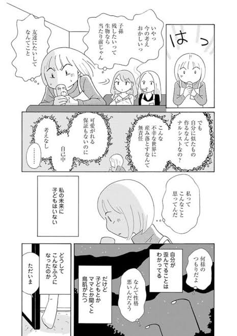 そういう主義があるんだ。姪は結婚しても子どもは産まないと言ってる。今の世の中で幸せにしてあげられる自信がないから、って。そういうことかな?+531
