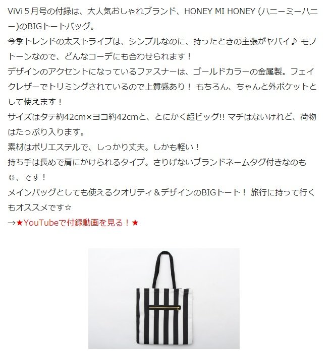 付録レビュー&動画【ViVi】(ヴィヴィ) 5月号 ハニーミーハニー ストライプどでかトート | MAGAZiiNA (マガジーナ)magaziina.comViVi5月号の付録は、大人気おしゃれブランド、HONEY MI HONEY (ハニーミーハニー)のBIGトートバッグ。 今季トレンドの太ストライプは、シンプルなのに、持ったときの主張がヤバイ♪