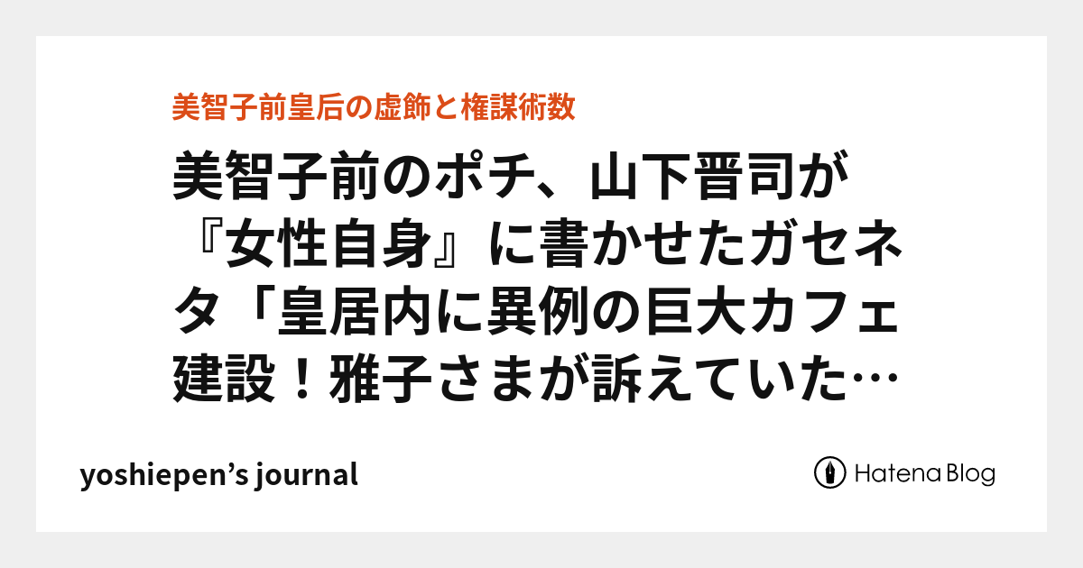 山下~美智子前のポチ、山下晋司が『女性自身』に書かせたガセネタ「皇居内に異例の巨大カフェ建設!雅子さまが訴えていた『皇室の情報発信』拠点に」 - yoshiepen’s journalwww.yoshiepen.net雅子皇后陛下が「皇居内にカフェを建設して、それを情報発信拠点に」と発案されたなんて、とんでもないガセネタ!あまりにもアホらしい記事。山下を始め宮内庁の「情報筋」とやら、よほど海外への劣等感に苛まれている?女性週刊誌の記者たちも彼らと同様に井の中の...