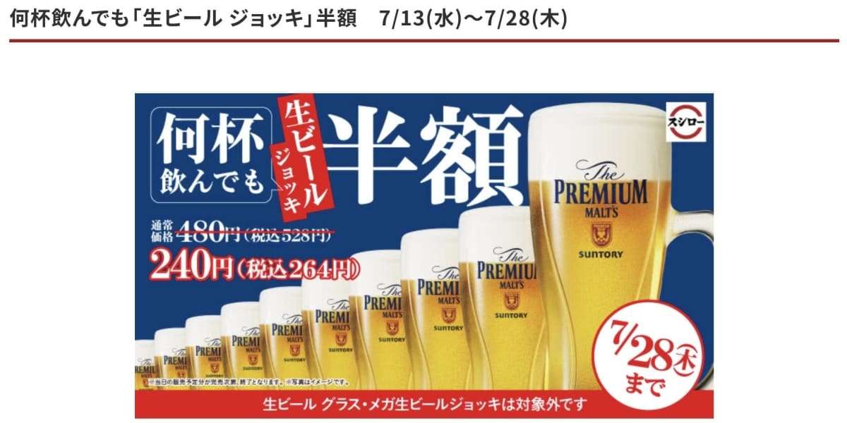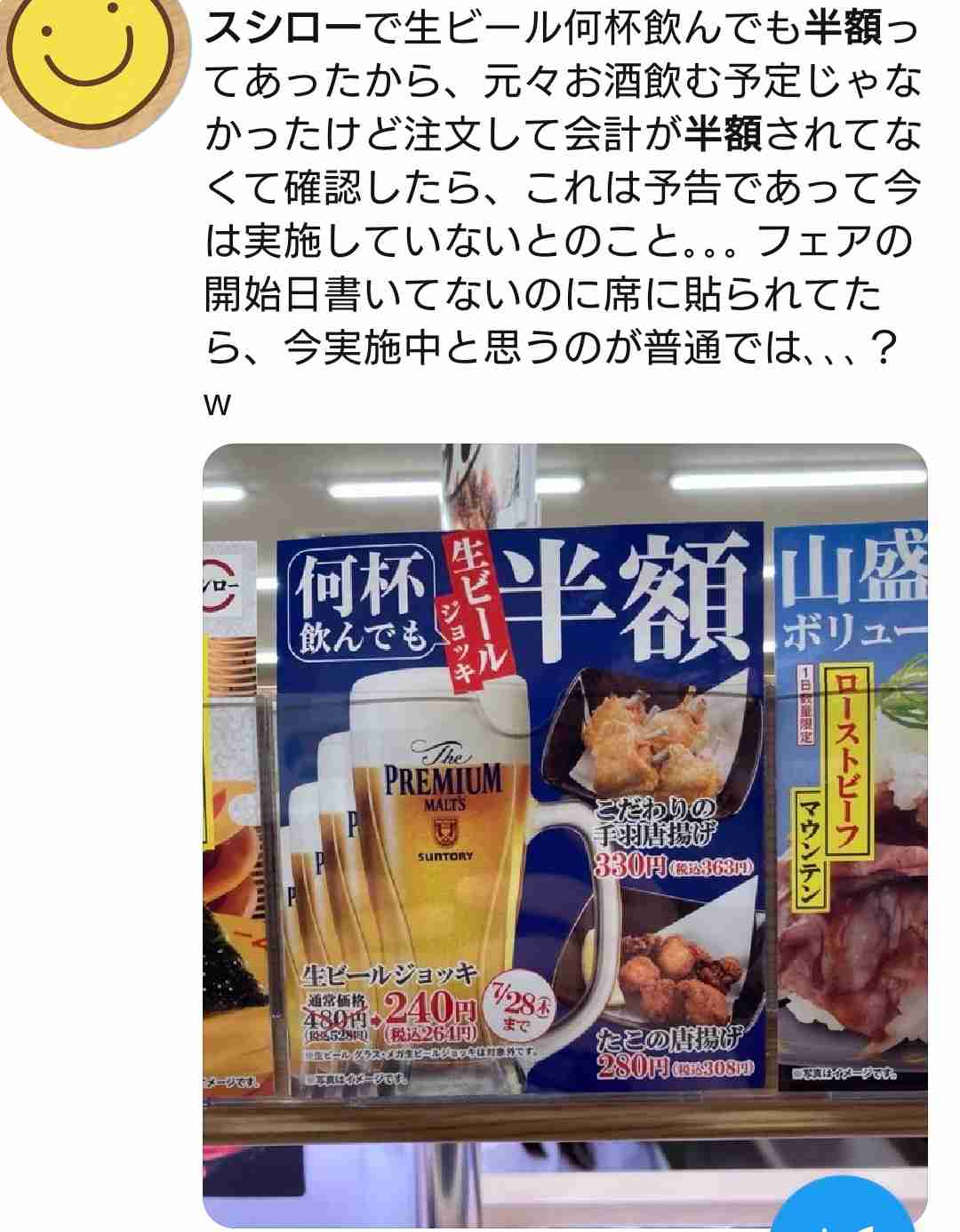 「スシローで生ビール何杯飲んでも半額ってあったから、元々お酒飲む予定じゃなかったけど注文して会計が半額されてなくて確認したら、これは予告であって今は実施していないとのこと」。回転寿司チェーン「スシロー」で、生ビール半額の店内掲示を見て注文したところ、会計時に通常の金額を請求されたというツイートが話題となっている。