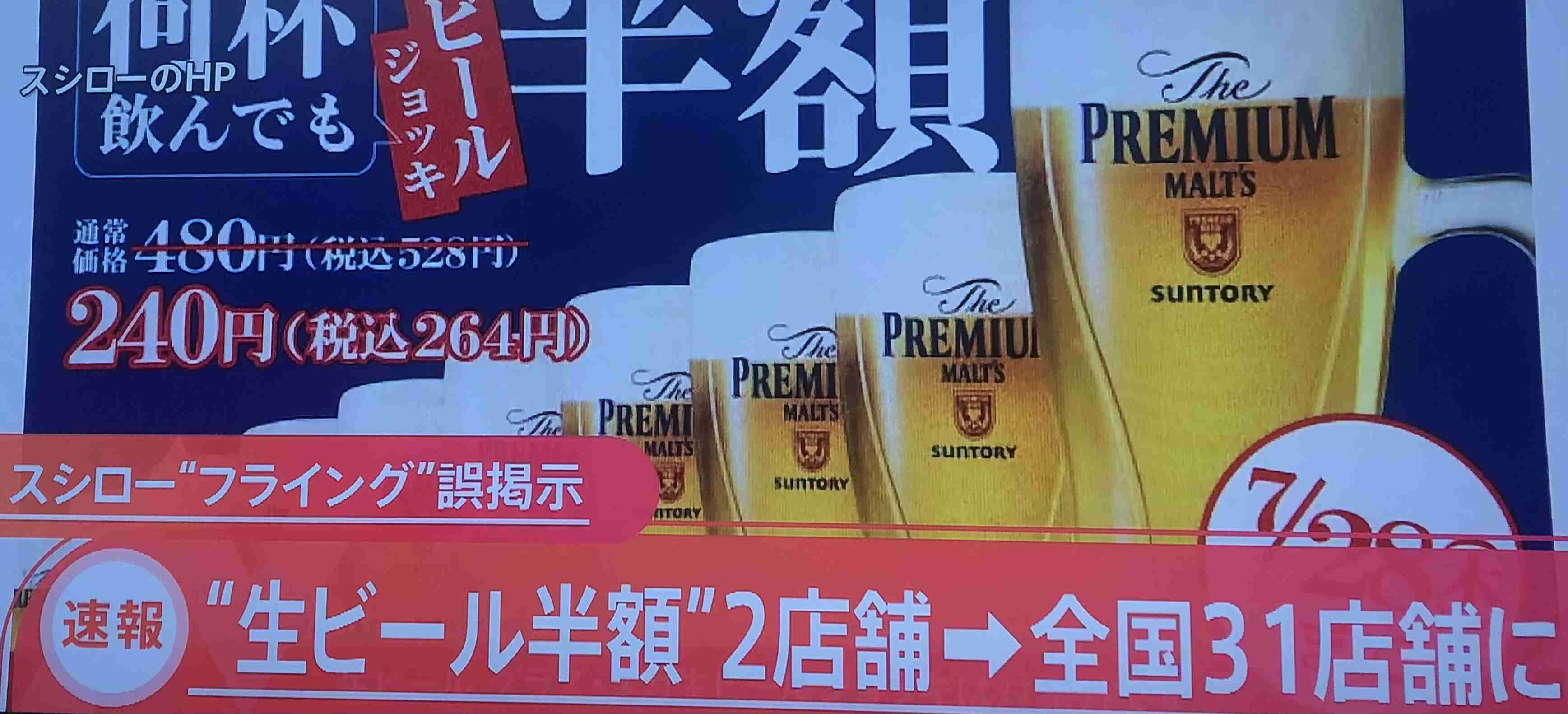 「あきんどスシロー」の発表によると、現時点では戸田店と相模原中央店の2店舗で誤った掲示が確認されており、7月10日から最長11日21時まで店頭ポスターを掲示していたという。誤って生ビールを購入した人には、レシート持参で1杯につき、差額の264 円(税込み相当額)を返金するとしている。+21