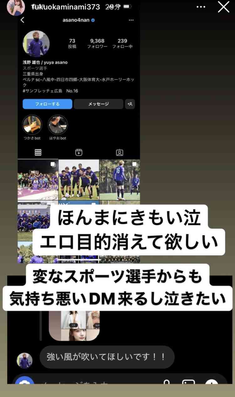 ・関連トピサンフレッチェ広島・浅野雄也選手 グラドルへの"セクハラDM"が波紋…チームも「事実」と認め、本人へ厳重注意girlschannel.netJリーグ「サンフレッチェ広島」に所属する浅野雄也選手(25)が、グラビアアイドルのInstagramに“セクハラなダイレクトメッセージ”を送ったとしてSNS上で物議を醸している。
