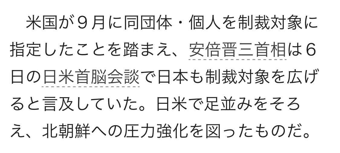 安倍内閣は7日、核・ミサイル開発を続ける北朝鮮への制裁措置として、北朝鮮の銀行や、中国やロシアなどで金融業に携わる北朝鮮人など9団体・26個人の計35団体・個人を資産凍結の対象に加えることを閣議了解…
