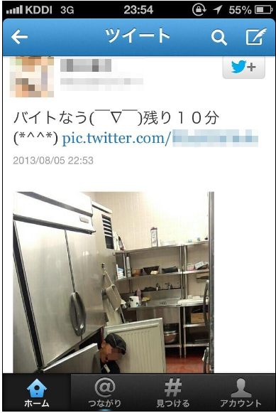 NEWSポストセブン|冷蔵庫に入りバイト先を閉店に追い込んだ学生 人生に悩み中www.news-postseven.com最近相次ぐツイッターでの“悪ふざけ暴露”騒動のなかで、最も衝撃的だったのは、東京・足立区のステーキハウス『ブロンコビリー』での一件だろう。店側は、悪ふざけをした元アルバイト従業員に損害賠償請求を検討中。その額は、「最高で2000万円程度の請求が可能ではないか」(民事裁判に詳しい弁護士)という。 問題のアルバイト従業員・Aくんはバイト中の8月5日22時53分、ツイッターで<バイトなう 残り10分>と、つぶやいた。そして、そこにはキッチンの大型冷凍庫に入りこみ、顔だけ外に出しているAくんの写真も添えられていた。 今年8月はすでに悪ふざけ投稿が社会問題となっていたため、Aくんのツイッターはす