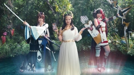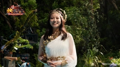 三国志を中心にさまざまな時代の武将たちが美少女になって登場する新感覚RPGゲーム『放置少女~百花繚乱の萌姫たち~』の新CM「放置しよう、いまだ!」篇に出演した今田美桜。CMでは、イソップ物語の「金の斧」をモチーフに、スマートフォンを泉に落とした男性の前に“美しき女神”として登場している。ゴールドの髪飾りと女神風の真っ白なシースルーワンピース姿が、話題になっている。