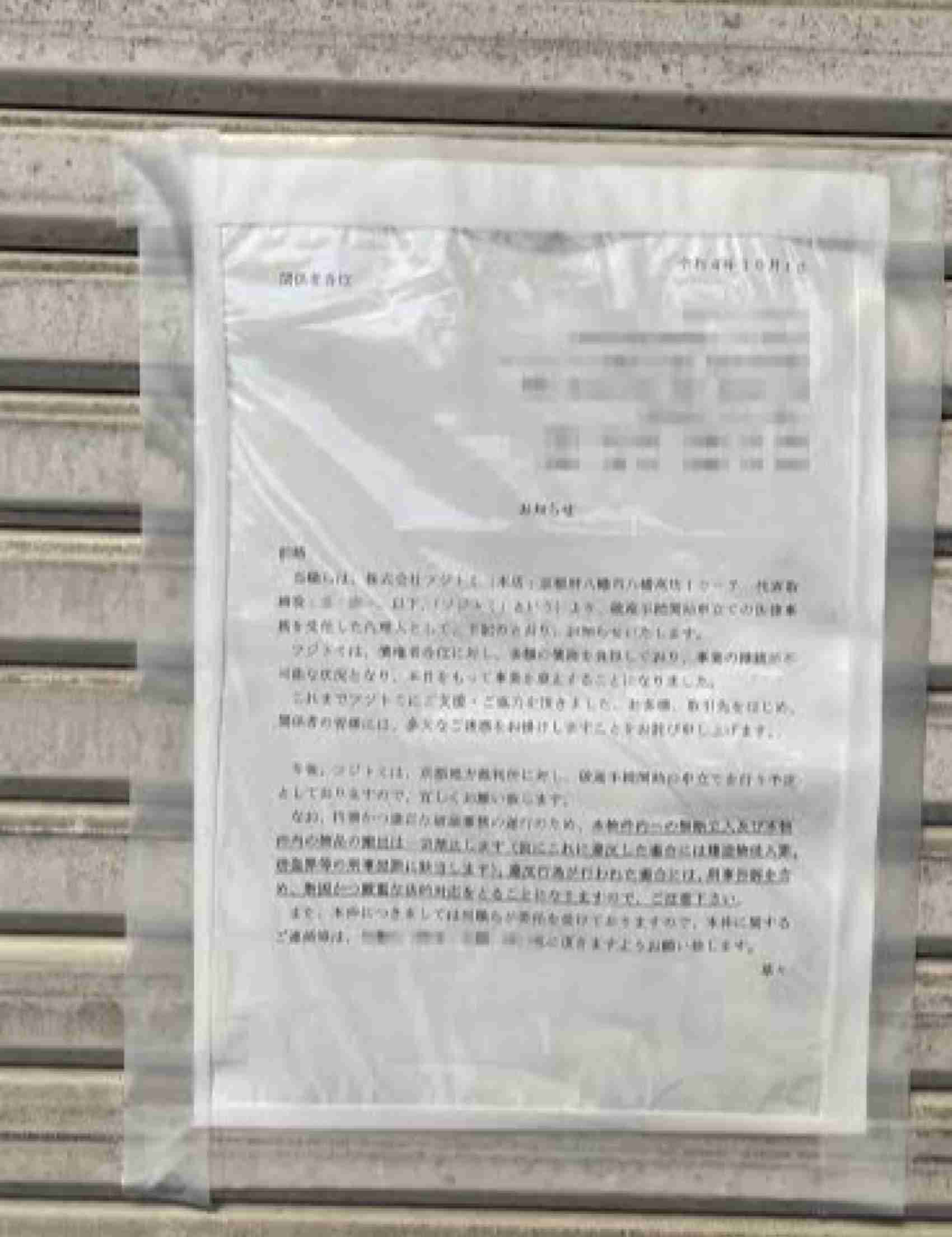 >「債権者各位に対し多額の債務を負担しており、事業の継続が不可能な状況となり、本日をもって事業を廃止することになりました」