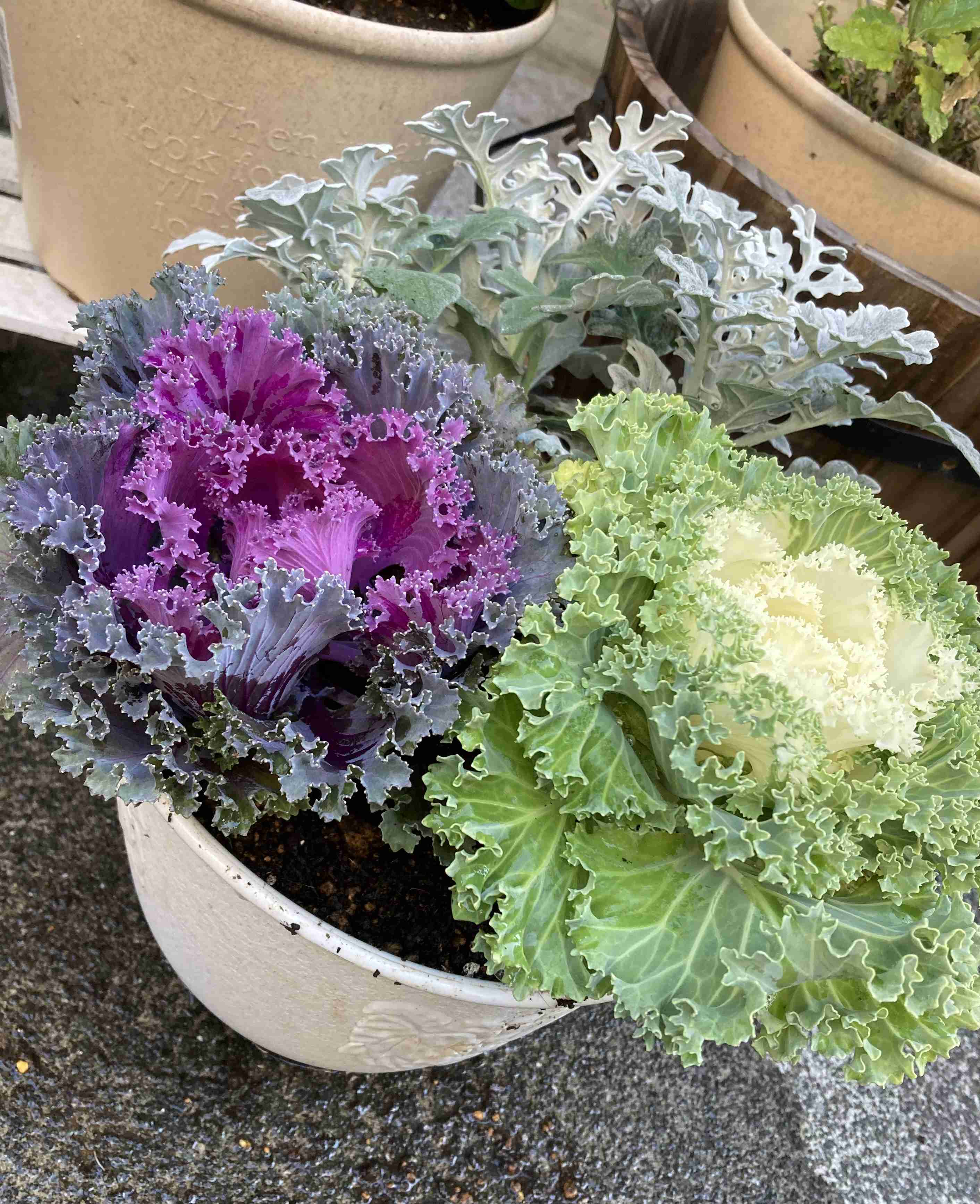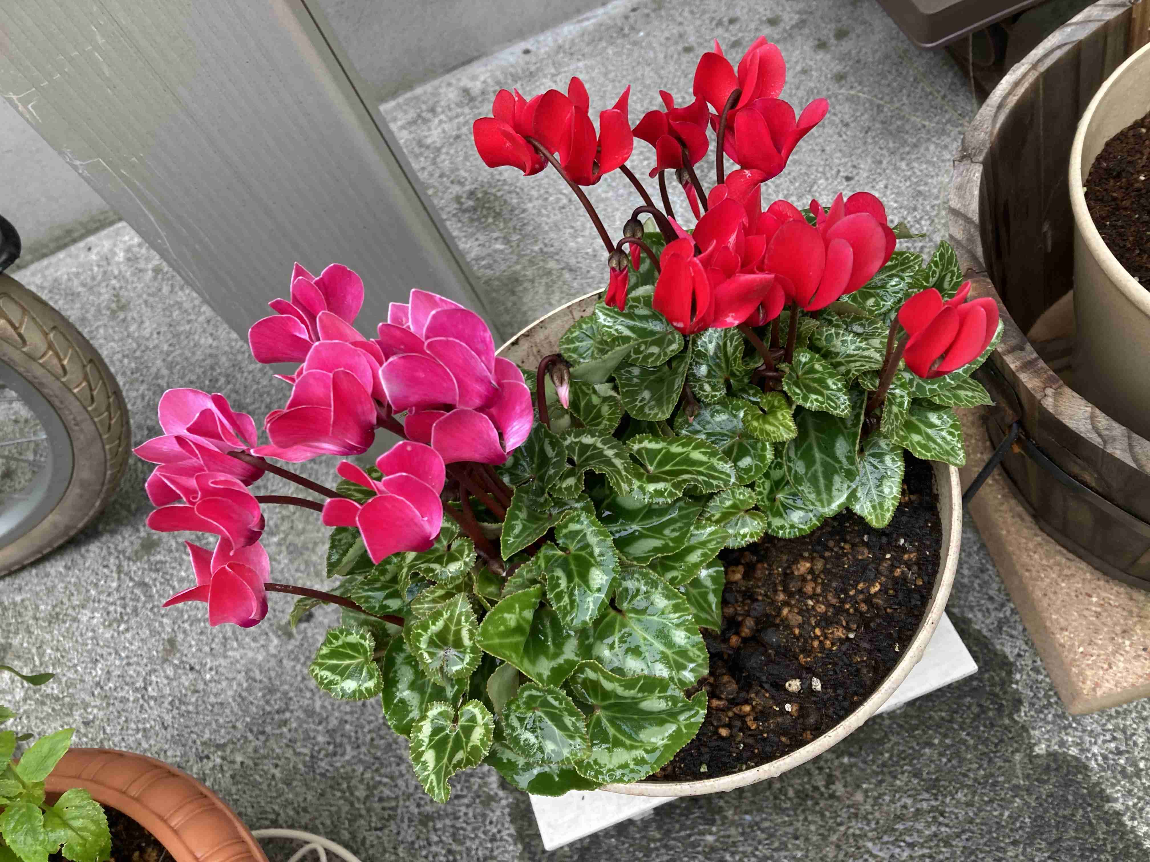 昨年寄せ植えにして飾っていたもの(画像左上)を空いていた大きな鉢にそのまま植えておいたらすごいことになっていました。