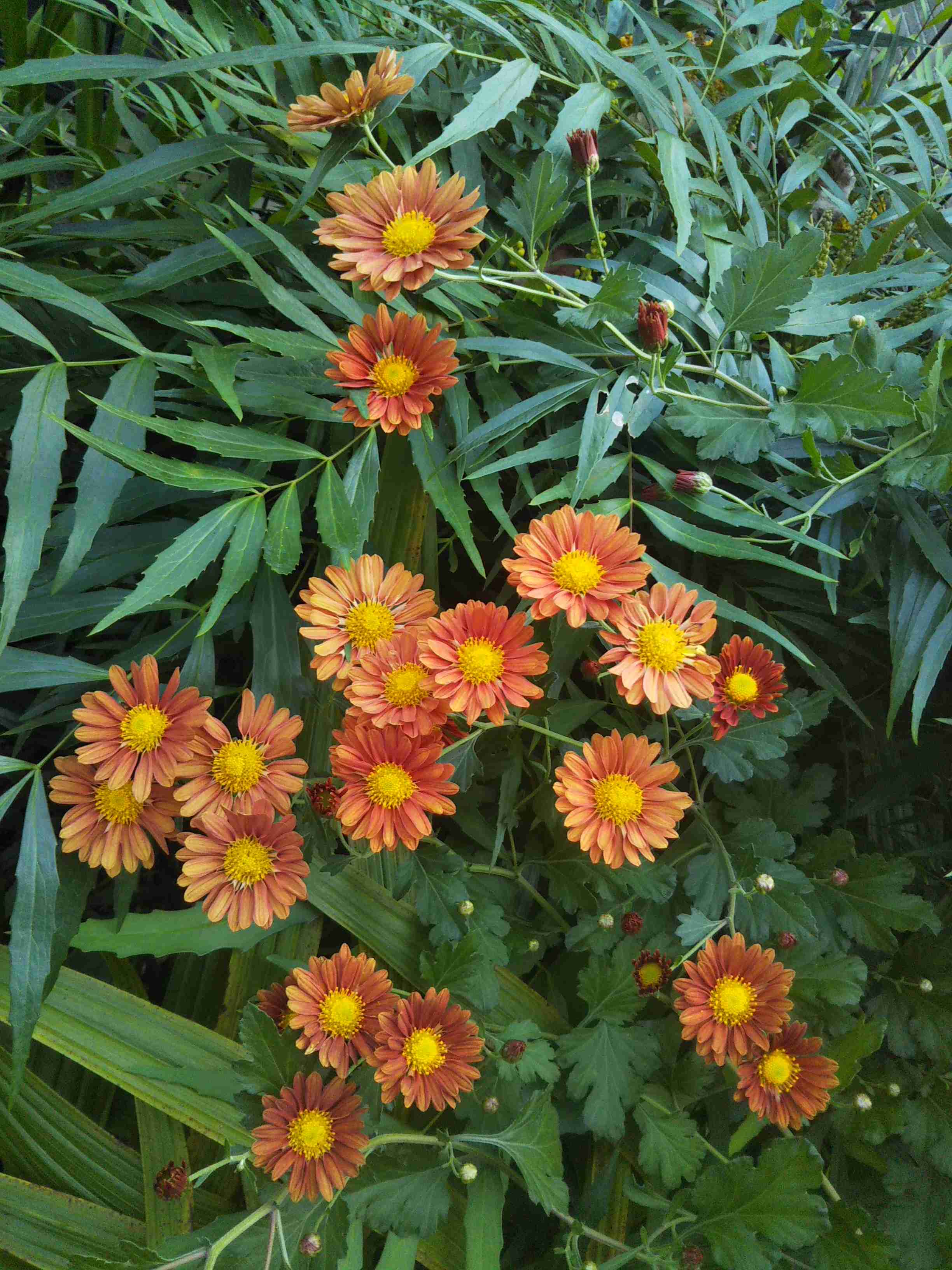 右側のオレンジの菊は太い1本の茎がすごくのびて私の胸の高さで咲いています。