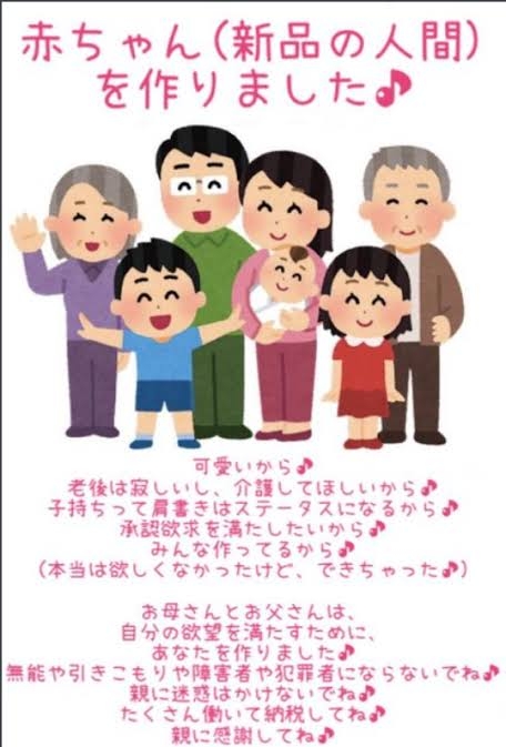 選択子なしの人周りに何組かいるけどそのうちの一人が、犯罪者になったり不登校になったり障害児産まれたりニートになったり、年老いて殺されたりするリスクが嫌で産みたくないって言い切ってたわ+10