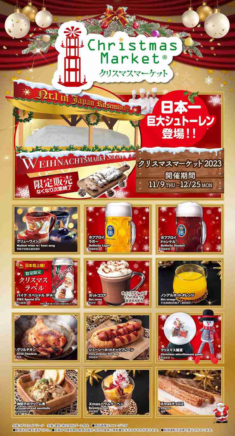 あと、この時期だと、もうソラマチでクリスマスマーケット始まってるね。クリスマスマーケット2023 | イベント | 東京ソラマチwww.tokyo-solamachi.jp本年も4Fスカイアリーナにて東京ソラマチクリスマスマーケット2023を開催いたします。 雪降るドイツのクリスマスをイメージした豪華な雪装飾ヒュッテ(ドイツ式小屋)や、イルミネーションと限定ライティングを眺めながらお食事やドイツのプレミアビール