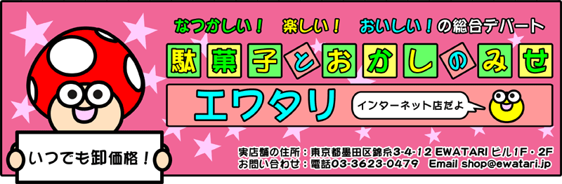 【駄菓子の通販】駄菓子とおかしのみせ エワタリewatari.jp【駄菓子の通販】駄菓子とおかしのみせ エワタリ 【駄菓子の通販】うまい棒・ヨーグル・チロルチョコ・ふ菓子・あんこ玉など駄菓子・おもちゃの大人買い、文化祭、お祭り用にも。【駄菓子とおかしの店エワタリfacebookページはこちら】いいね!を押してね! 全ての...
