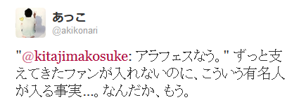 @kitajimakosuke 公演中はケータイ禁止です。 アラフェスなう とかしないで下さい。 非常識です。 電源消して下さい。 アラフェスに行ってるならばケータイとか見ないで嵐見て下さい。+51