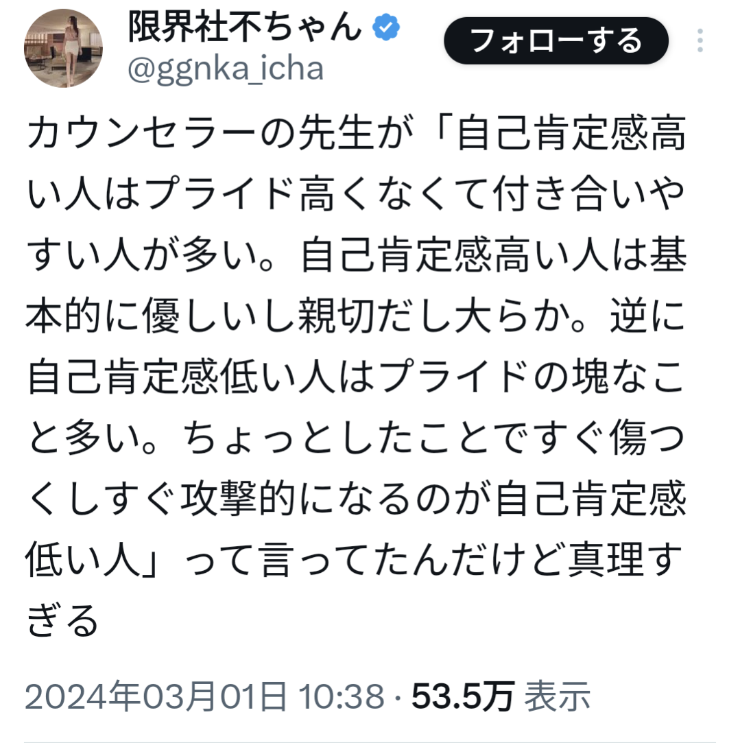 分かる。自己肯定感が低い人って、プライド高いんだよね。プライドの塊。