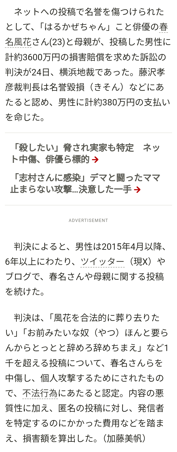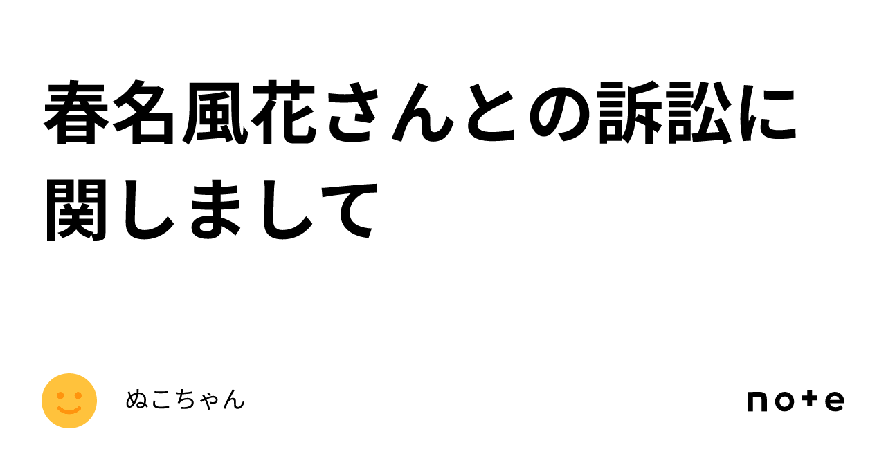 春名風花さんとの訴訟に関しまして|ぬこちゃんnote.com春名風花、誹謗中傷裁判終了を報告 327万5000円の賠償金認められ胸中「10年以上積み重ね続けた傷に対する金額」 ニュース| 俳優で声優の“はるかぜちゃん”こと春名風花(23)が24日、自身のXを更新。自身への誹謗中傷をめぐる裁判が終わ www.oricon.co.jp ...