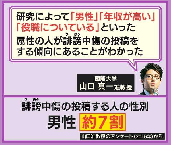 勝手なイメージで誹謗中傷って女性が多いのかなって思ってたら7割が男性って……すごい多いね。+6