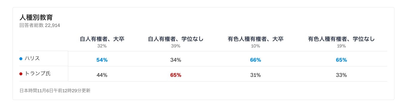 ハリスとそのブレーンが大した政策を打ち出してこなかったことと比較すると、学歴の高い人がハリスを支持しているだなんて、負け惜しみでしかないと思うわ+6