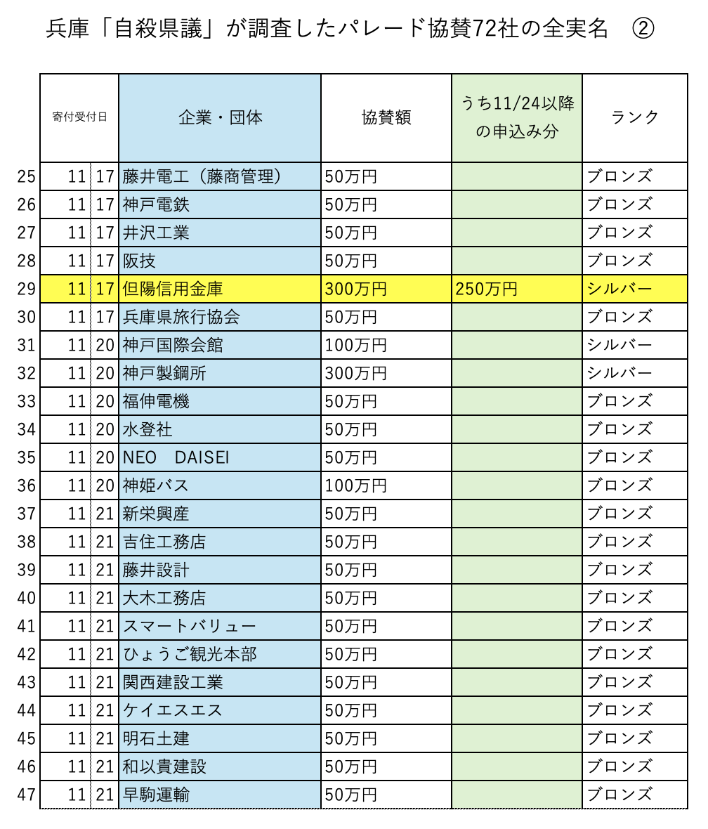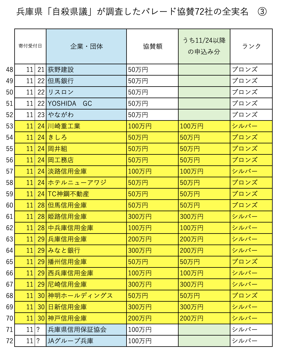 パレードは2023年11月23日に実施されている。ところがパレード後にもかかわらず、13の金融機関と同様に寄付をしている企業が7社ある。今回の3つのリストのなかで黄色でマークしてある部分だ。