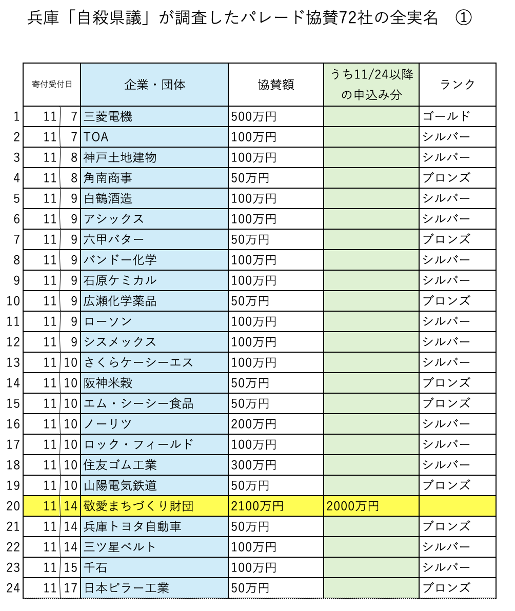 告発文書には、そう具体的な内容が書かれている。竹内氏は、「斎藤知事最大のスキャンダル」だとして、ここに書かれている内容の徹底的な調査をすべきだと、記者に何度も語り、調査をしていた。それが今回公開する一覧表である。兵庫県に寄付をしたすべての企業や団体の寄付金額が判明した。