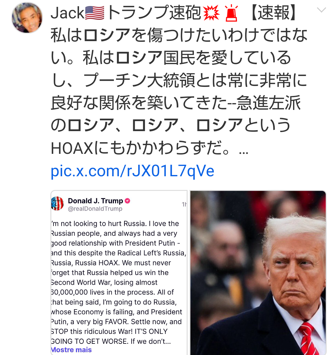 アメリカ側と会談するためにサウジに到着したラブロフ達が飛行機のタラップから降りてくる画像に、有名な親露派インフルエンサーがロシア擁護するコメント付けてXに投稿してたけど、マスクはそれに返信する形で一緒になって「有能なリーダーシップのあるべき姿」だと投稿してたわ。