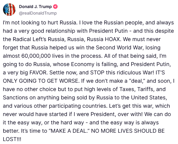 さらに続けて、「自分が大統領だったら、そもそも始まらなかったはずのこの戦争を終わらせよう! 簡単な方法でも難しい方法でもできるが、いつだって簡単な方法の方がいいに決まっている。今こそ『取引をまとめる』時だ」とも、大統領は書いた。