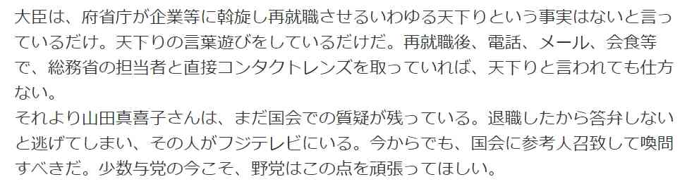 さらに、総務官僚がフジテレビへの“天下り先”を確保するために対応が甘くなっているのではないか、という指摘には「国家公務員の再就職に関しては、公務の公正性とそれに対する国民の信頼を確保することが重要であり、総務省としても、職員の斡旋等を禁じた再就職規制の遵守を徹底している。総務省職員の再就職については、同社が自らの判断で採用したものと理解している。府省庁が企業等に斡旋し再就職させるいわゆる天下りという事実はない。今後も引き続き、法に則り、放送行政を適切に担って参りたい」と答えた。+4