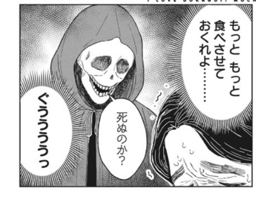 もっと食えって唆すんじゃなくて、その人の本来の死期を迎えるために修正しに来てくれてるのかも。優しいね(というか自分の中の危機感が死神の姿で現れてるんだろうけどさ)+6