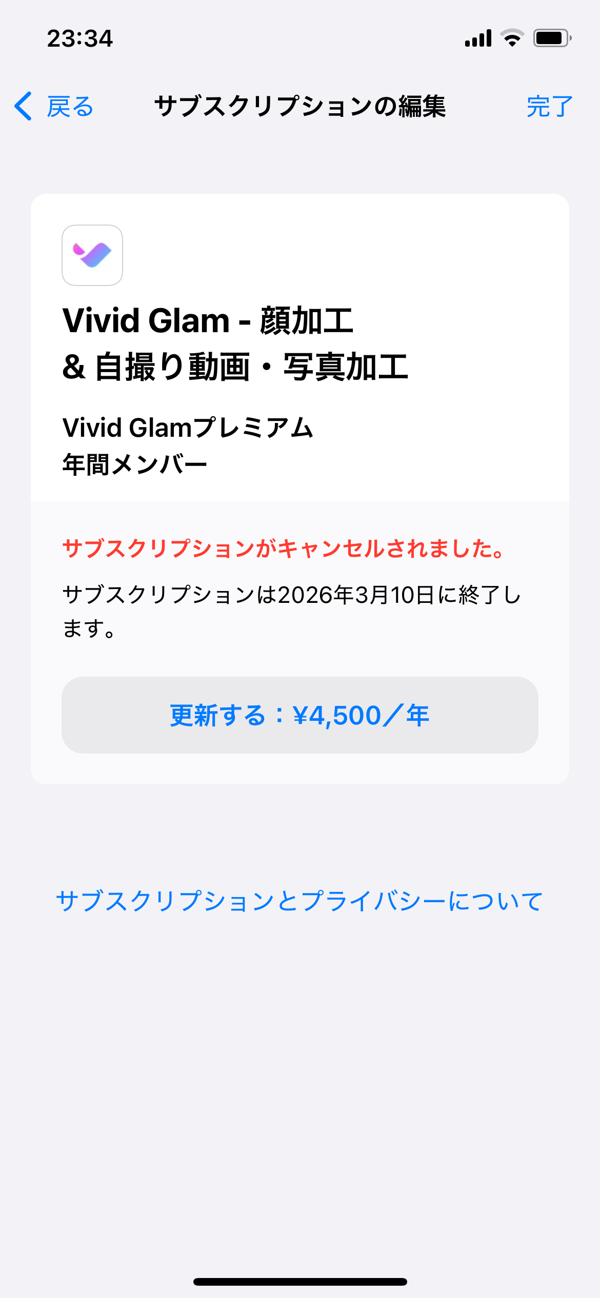 2、サブスクリプションがキャンセルされました。と赤文字が出ているのですが、アプリの解除はできている状態でしょうか?自動更新が一年後にされる心配はないでしょうか?