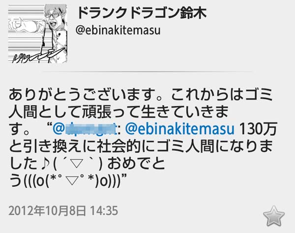 ドランク鈴木拓「皆さんの努力でヤフートップに。次回の炎上で会いましょう!」 | ニコニコニュースnews.nicovideo.jpお笑いコンビ「ドランクドラゴン」の鈴木拓(37)が「炎上」に成功したと、10月15日(2013年)にツイッターで喜んでいる。「やりましたよ! 皆さんの努力が報われました。Twitter炎上でYahooニュースにのることができました」と報告している。 13日放送のドッキリ番組「アバケン」(フジテレビ系)で、相方の塚地武雅(41)からウソの結婚予定を打ち明けられた。内緒にしておくよう言われたが周囲にペラペラと話してしまったため、放送後にツイッター上で人間性を疑う声が出ていた。