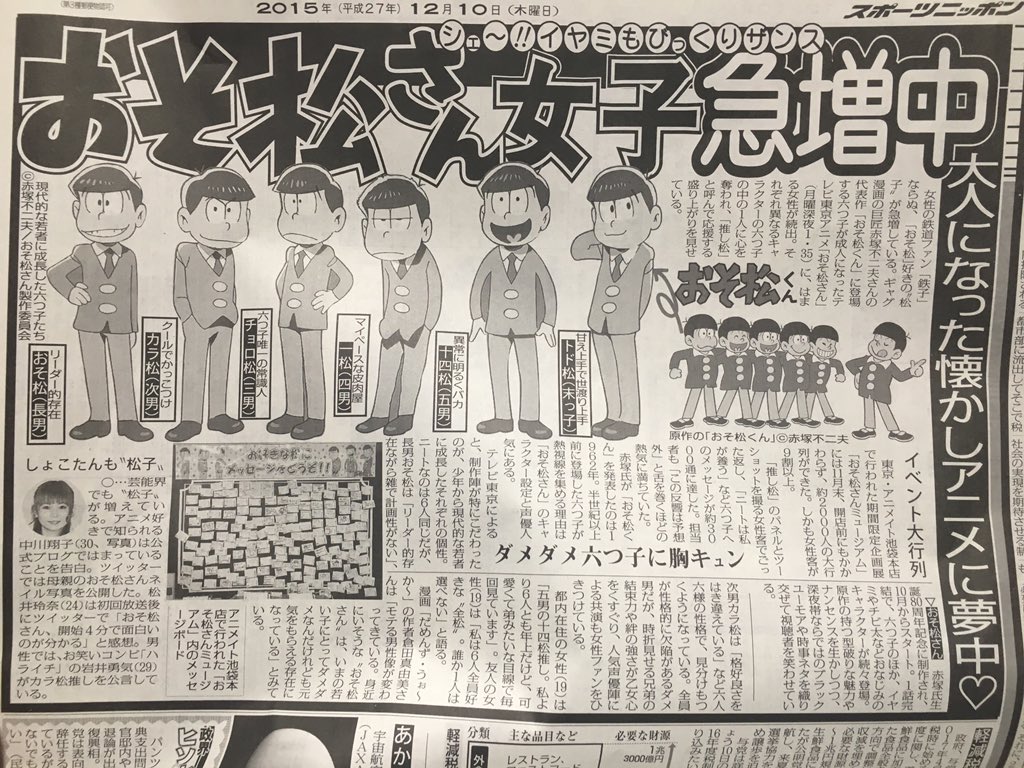 じょし松さんも面白かった。一子(左から4番目が一松)はインプラントらしいです(笑)。![「おそ松さん」にハマる女性が続出 新聞で「松子」として紹介される]()