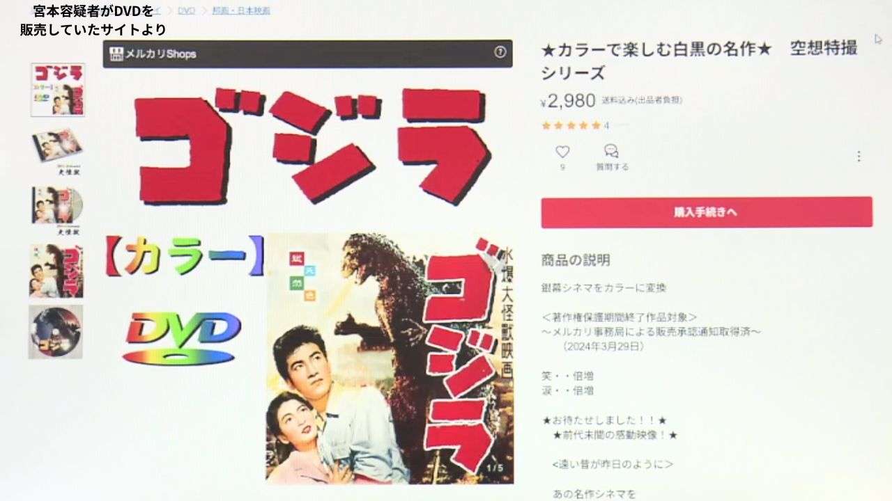 警察によると、宮本容疑者は「ゴジラ」以外にも、白黒映画をカラー化したものをDVDにして、フリーマーケットサイトやアプリなど、インターネット上で販売していました。