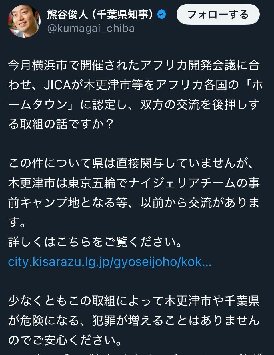木更津市「ナイジェリアのホームタウン」認定で混乱、熊谷・千葉知事のX投稿に批判も(1/3ページ) - zakⅡwww.zakzak.co.jp千葉県の熊谷俊人知事は自身のX(旧ツイッター)で、「JICAアフリカ・ホームタウン」に関する市民からの質問に対し、強い口調で返答したことが物議を醸している。この問題は、国際協力機構(JICA)が木更津市をナイジェリアの「ホームタウン」とし…